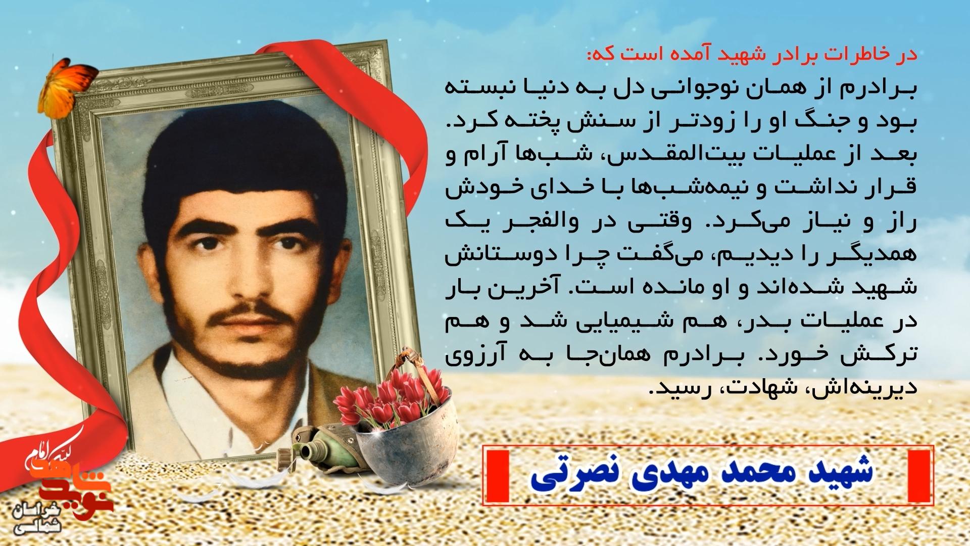 به گزارش نوید شاهد خراسان شمالی، شهید «محمدمهدی نصرتی» بیســت و پنجم مرداد ۱۳۴۳، در روســتای بام از توابع شهرستان اســفراین چشــم به جهان گشــود. پدرش علی اکبر و مادرش بلبل نام داشت. تا سوم متوسطه در رشته انسانی درس خواند. ســپس به فراگیری علوم دینی و حوزوی پرداخت. روحانی بود. به عنوان بسیجی در جبهه حضور یافت. بیست و سوم اسفند ۱۳۶۳، با سمت تک تیرانداز در جزیــره مجنون عراق بر اثر اصابت ترکش خمپاره به شــهادت رسید. پیکر وی را در گلزار شهدای زادگاهش به خاک سپردند.