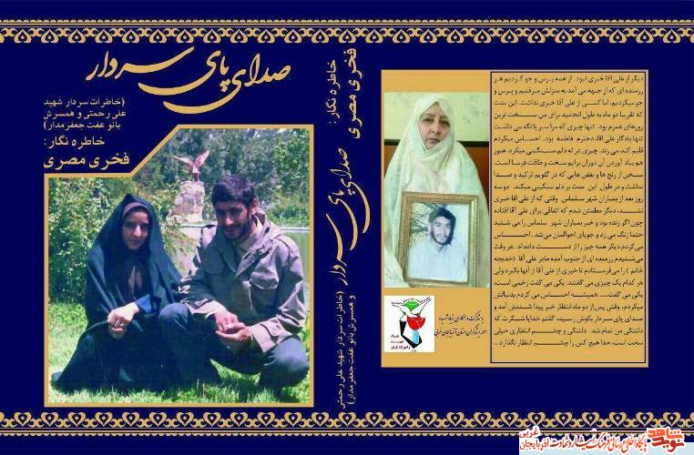 نوید شاهد آذربایجان غربی: کتاب «صدای پای سردار» بیست و سومین اثر فخری مصری، خاطره نگار دوران دفاع مقدس در 453 صفحه منتشر شده است.این کتاب حکایت عاشقانه آرام در دل جنگ، خاطرات سردار شهید «علی رحمتی» و همسرش عفت جعفرمدار است که با مشارکت بنیاد شهید و امور ایثارگران استان آذربایجان غربی و توسط انتشارات میعاد اندیشه در سال 97 منتشر و چاپ گردید.