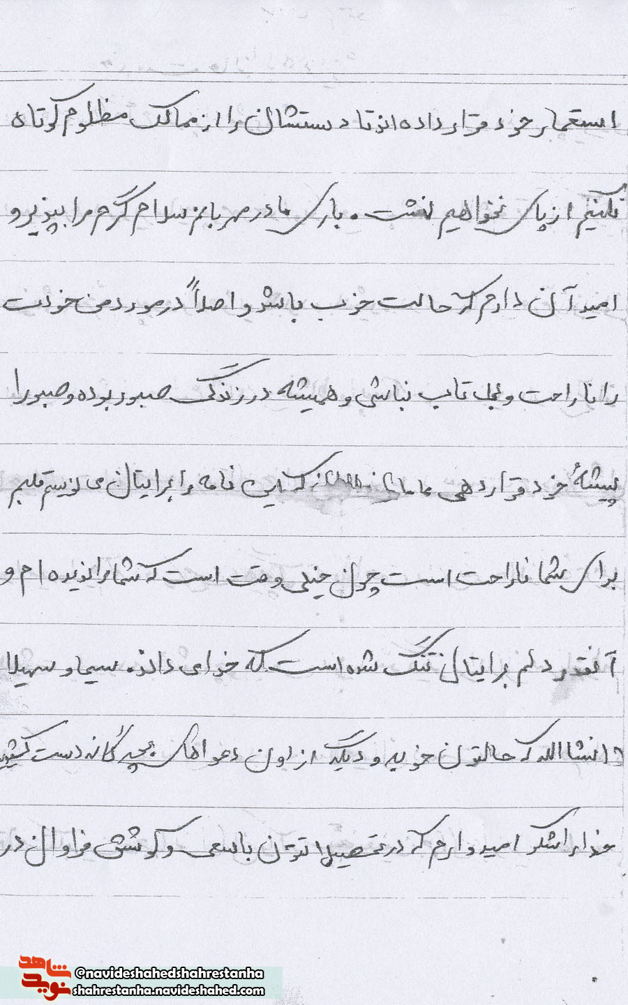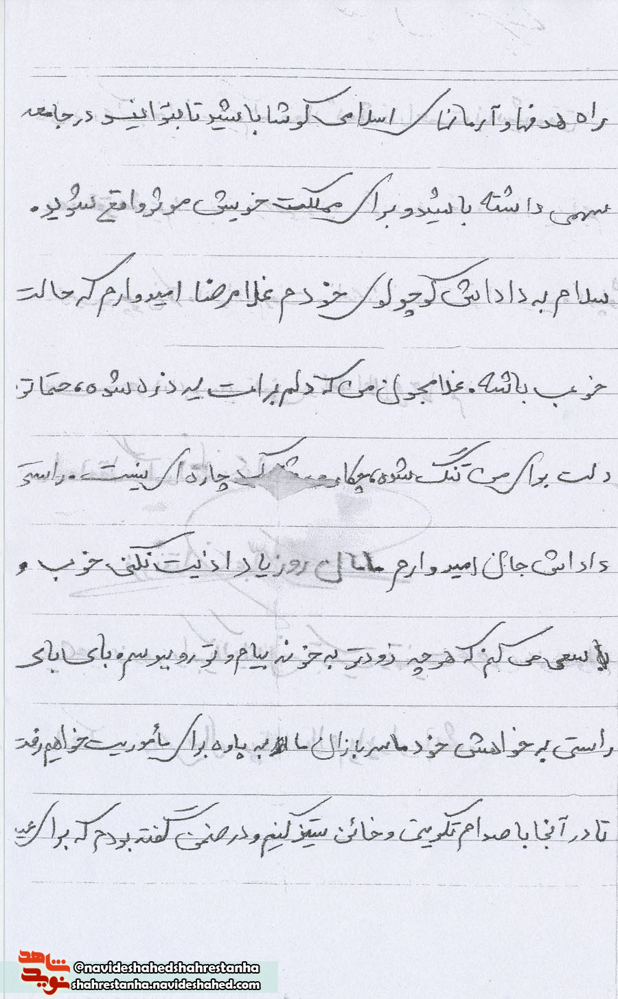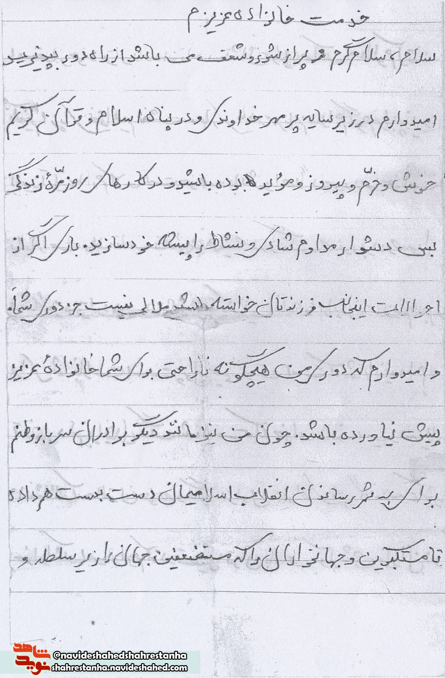 و امیدوارم که دوری من هیچگونه ناراحتی برای شما خانواده عزیز پیش نیاورده باشد. چون من نیز مانند دیگر برادران سرباز وطنم برای به ثمر رساندن انقلاب اسلامیان دست به دست هم داده تا مستکبرین و جهانخواران را که مستضعفین جهان را زیر سلطه و استعمار خود قرار داده اند.