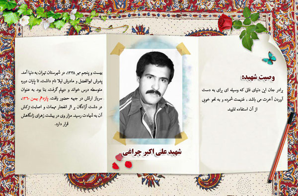 به گزارش نوید شاهد شهرستان های استان تهران؛ شهید علی اکبر چراغی/ بیست و پنجم مهر 1338، در شهرستان تهران به دنیا آمد. پدرش ابوالفضل و مادرش لیلا نام داشت. تا پایان دوره متوسطه درس خواند و دیپلم گرفت. بنا بود. به عنوان سرباز ارتش در جبهه حضور یافت. پانزدهم بهمن 1360، در دشت آزادگان بر اثر انفجار مهمات و اصابت ترکش آن به شهادت رسید. مزار وی در بهشت زهرای زادگاهش قرار دارد.
