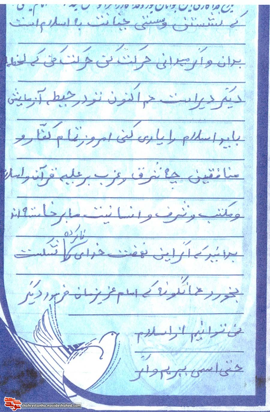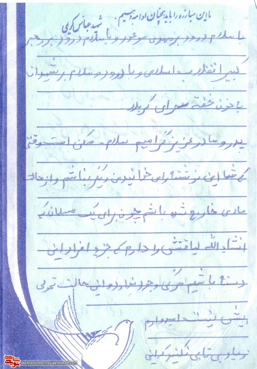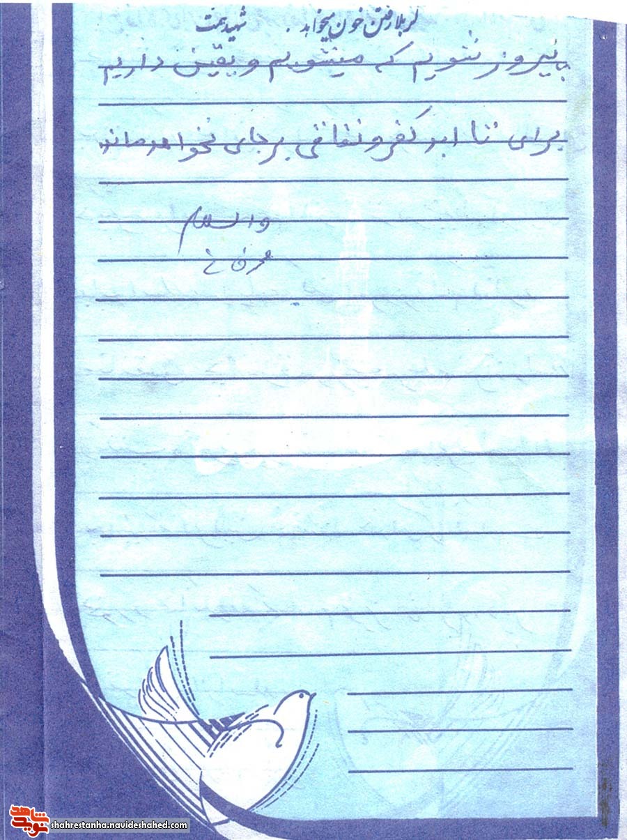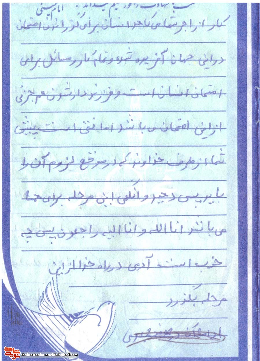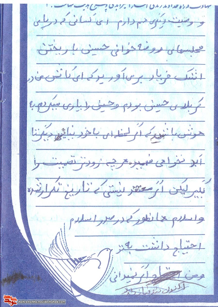 با سلام و درود بر مهدی موعود و با سلام و درود بر رهبر کبیر انقلاب اسلامی و با درود و سلام بر شهیدان به خون خفته ی صحرای کربلا . پدر و مادر عزیز و گرامیم سلام. ممکن است وقتی که شما این نوشته را می خوانید من دیگر نباشم و از حالت مادی خارج شده باشم چون برای یک مسلمان که ان شاء الله لیاقتش را دارم که جزء این دسته از افراد باشم مرگی وجود ندارد و این حالت تحولی بیش نیست.