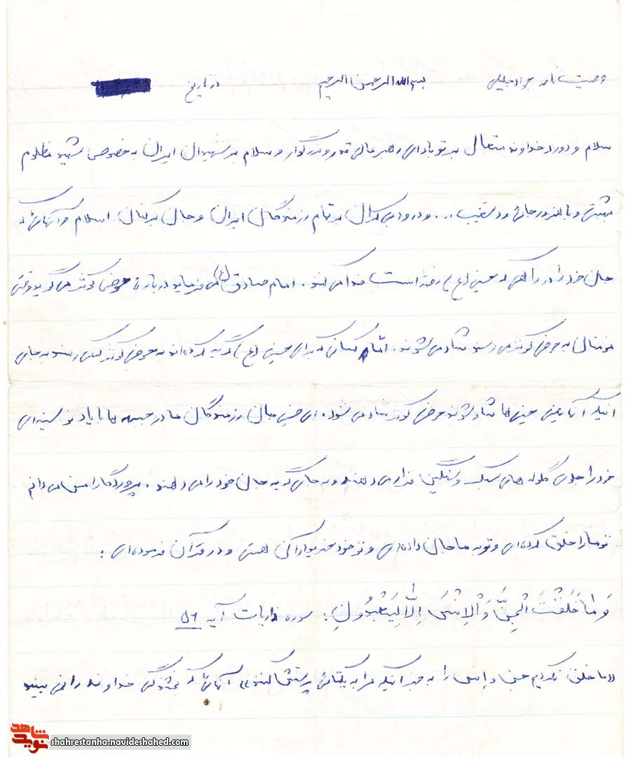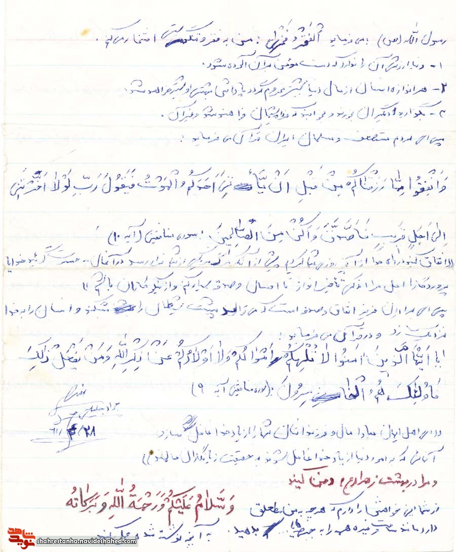 والسلام عليکم ورحمة الله وبرکاته از شما خواهش دارم که هرچه به من متعلق دارد مانند ساعت وغيره همه را به جبه بدهيد وبه انچه نوشته شد عمل کنيد.