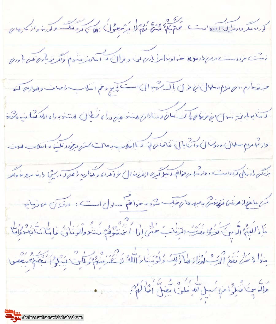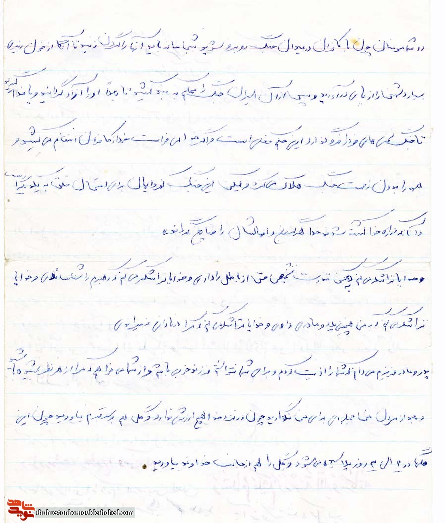 خداوندا مرا ياري کن وبخوان که آماده تر شويم واگر تو ياري نکني ياوري جز تو ندارم .اي مردم مسلمان اين خون پاک شهيدان است که پيچ و خم انقلاب راه صاف و هموار می کند با ريخته شدن اين خونهای پاک کسانی که در نادانی هستند يعنی در راه شيطان هستند به راه الله کشانيده شوند و ازشما مردم مسلمان و دوستان و آشنايان تقاضا می کنم که با انقلاب به حالت سستی برخورد نکنيد که انقلاب هدف بزرگی را دنبال کرده است و از شما می خواهم جلوگيری از فرزندان خرد نکرده و بگذاريد راهی که در پيش دارند بروند و اگر کسی مانع از رفتن فرزندش به جبهه های جنگ شود به خدا قسم مسئول است.