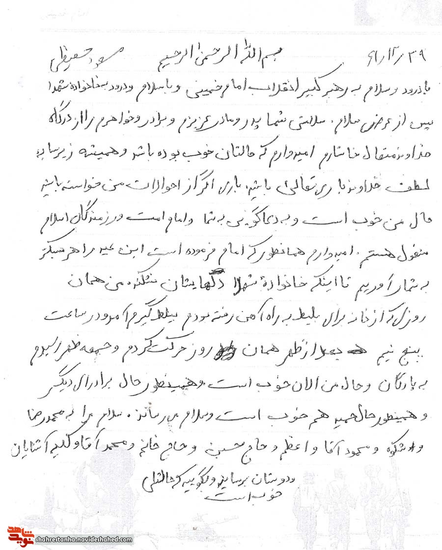 باری اگر از احوالات من خواسته باشید حال من خوب است و به دعاگویی به شما وامام امت و رزمندگان اسلام مشغول هستم. امیدوارم همتنطور که امام فرموده است این عید را هر چه سبکتر بشمار آوریم تا اینکه خانواده شهدا دلشان نشکند.