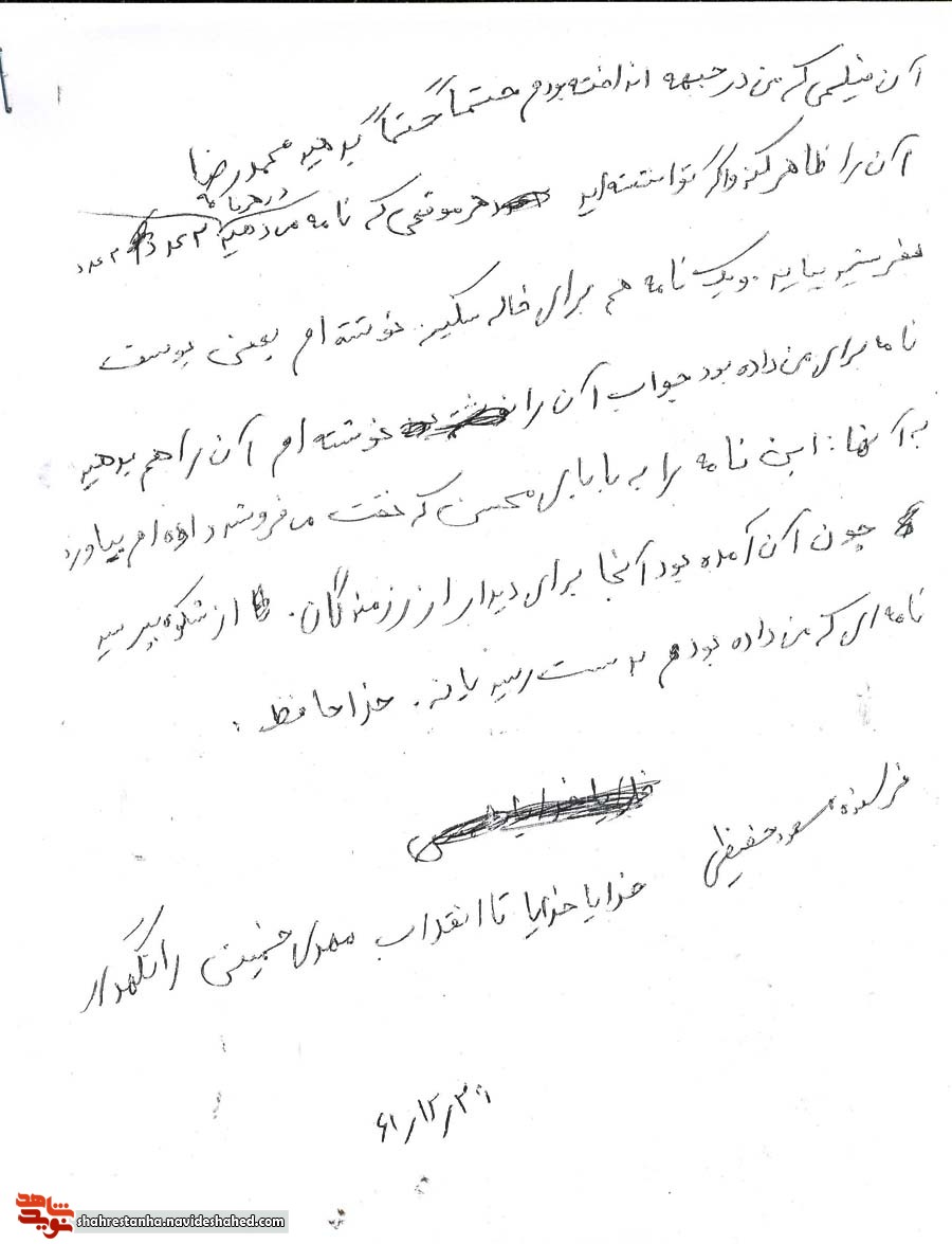 ویک نامه هم برای خله سکینه نوشتم یعنی یوسف نامه را برای من داده بود جواب آن را نوشتم آن را هم بدهید به آنها این نامه را به بابای محسن که نفت می فروشد داده ام بیاورد چون آن آمده بود انجا برای دیدار رزمندگان . از شکوه بپرسید نامه ای که من داده بودم بدستش رسید یا نه. خداحافظ