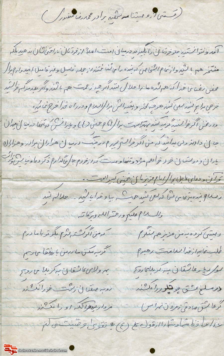 و در ضمن اگر خواستید گریه کنید بهتر است برای اما محسن (ع) و یارانش که تنها در میان میدان جان دادند ولی بدانید که من اگر خواستم بمیرم در جنگ در میان هزاران برادر و هزاران یاران و دوستان خود خواهم مرد و تنها وصیت که از خودم جا می گذارم ذکر و دعا و نیایش و قرائت قرآن و دعای عاجل برای امام عزیزمان خمینی کبیر است.