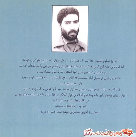 « امروزتسلیم امامیم ..... اما فردا ولی فقیه این کشور هرکس که باشد ..... در مقابلش تسلیمیم. ولی فقیه استثناء ندارد ...... امام ولایت دارد و نائب ولی عصر(عج) است. فردا این مسئولیت بر عهده ی هرکس قرار گرفت، سرتا پا گوش به فرمان او هستیم..... این رمز بقاء انقلاب ماست. »