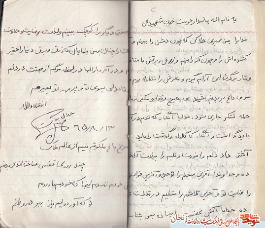 خدایا آنگاه که قدم درآن باید گذاشت و آنگاه که باید گلوله و گوشت را باید آشتی داد. دلم را به نورت و قلبم را به یادت آرامش ده و خداوند آخرین سخنم را توحید و آخرین خواستم{خواسته ام} رضایت تو و آخرین تلاشم را تسلیم درمقابلت قرارده.