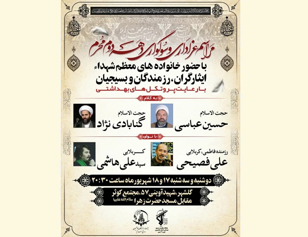 عزاداران حسینی برای شرکت در این مراسم سوگواری می توانند در مجتمع کوثر واقع در مشهد، گلشهر، شهید آوینی 57، مقابل مسجد حضرت زهرا (س) حضور یابند.