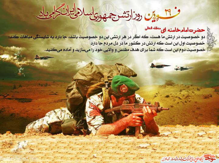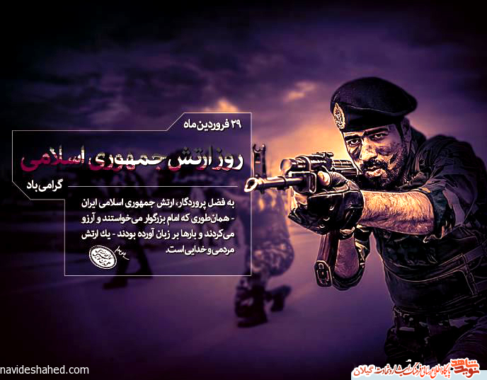 نویدشاهد - آنچه که امروز بدان می بالیم مرهون حماسه آفرینی و پایمردی شجاعانی است که در 8 سال دفاع مقدس از کارزاری شگرف و در مقابل تمامی قدرت های روز جهان آبدیده شدند و سربلندی و افتخار را برای میهن عزیز خویش به ارمغان آوردند. بمناسبت بیست و نهم فروردین روز ارتش جمهوری اسلامی پوستری زیبا تقدیم مخاطبان می گردد.