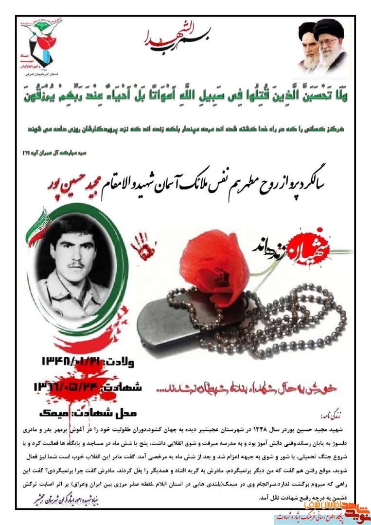 به گزارش نوید شاهد آذربایجان شرقی، شهید "مجید حسین پور" بیستم و یکم فروردین 1348 در شهرستان عجب شیر به دنیا آمد. پدرش مقصودراننده بود و مادرش رقیه نام داشت. تا پایان دوره راهنمایی درس خواند. به عنوان گروهبان سوم ارتش در جبهه حضور یافت. بیست و چهارم مرداد 1366 در میمک توسط نیرو های عراقی براثر اصابت گلوله به شهادت رسید. پیکر او را در زادگاهش به خاک سپردند.