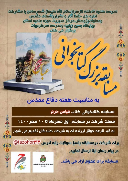 به گزارش نوید شاهد همدان، مدرسه علمیه فاطمه الزهرا (س) شهر سامن با مشارکت اداره کل حفظ آثار و نشر ارزشهای دفاع مقدس، معاونت پژوهش مرکز مدیریت حوزه علمیه استان و پایگاه بسیج زینبیه و مدرسه سرگرد بیات مسابقه کتابخوانی برگزار میشود.