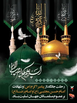 به گزارش نوید شاهد استان قم، ایام شهادت و سوگواری حضرت ختمی مرتبت پیامبر رحمت محمدمصطفی «ص»و امام حسن مجتبی کریم اهل بیت «ع» و ثامن الحجج امام رضا غریب الغربا«ع» بر امام زمان عج و همه مسلمانان جهان تسلیت باد.