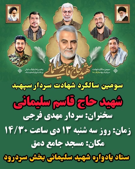 به گزارش نوید شاهد همدان، سومین سالگرد شهادت سپهبد «حاج قاسم سلیمانی» در شهر دمق برگزار میشود.