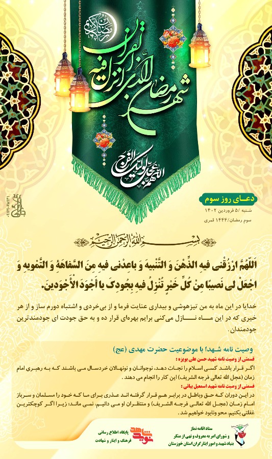 ایگاه اطلاع رسانی ایثار و شهادت استان خوزستان فرا رسیدن ماه مبارک رمضان، ماه تقوا و بندگی را به عموم مخاطبان عزیز این رسانه تبریک عرض می نماید و دعای مخصوص هر روز این ماه عزیز را که مزین به وصیت نامه شهدای والامقام با موضوعیت مهدویت می باشد را با همکاری ستاد اقامه نماز و شورای امر به معروف و نهی از منکر بنیاد شهید و امور ایثارگران خوزستان برای علاقه مندان منتشر می کند