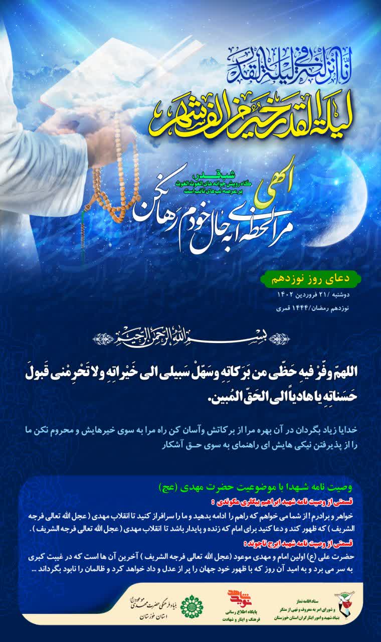 شبهای قدر از جمله شبهای پر فضیلت و با اهمیتی است که از شب نوزدهم ماه مبارک رمضان آغاز میشود. پایگاه اطلاع رسانی ایثار و شهادت استان خوزستان فرا رسیدن شب قدر، که شب ارتباط خداوند با انسان است و قرآن را بر پیامبرش حضرت محمد «ص» نازل کرد، را به همه مخاطبان تسلیت عرض می نماید و دعای مخصوص این روز را که مزین به وصیت نامه شهدای والامقام با موضوعیت مهدویت می باشد را با همکاری ستاد اقامه نماز و شورای امر به معروف و نهی از منکر بنیاد شهید و امور ایثارگران استان خوزستان را برای علاقه مندان منتشر می کند.
