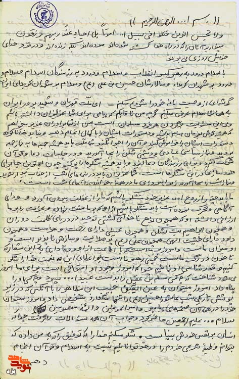 شرکت و هرچه شما کردید شبها جمعه به مسجد بروید و دعای کمیل بخوانید. ای پدرو ای مادر از شما می خواهم که اگر که یک فرزند ناقابل شما هستم اگر در راه خدا شهید شدم خواشحال باشید و افتخار بکنید که چنین فرزندی داشتید و در راه خدا دادید. چون ما از خدا هستیم و با گشتمان به سوی اوست نباید ناراحت بشوید چون این راه هم افتخار ماست. ای پدر و ای مادر نباید از شهادت من ناراحت شوید که دشمنان اسلام خوشحال شوند از شما می خواهم که اگر من شهید شدم و مرا آوردند مثل آنکه برای عروسیم خوشحالی می کردید برای شهادتم هم خوشحال باشید. ای خواهر و ای برادر از شما می خواهم که ادامه دهنده راه شهدا شوید ای برادر از تو می خواهم که جانت را در راه خدا فدا کنی و ای خواهر از تو می خواهم که مانند زینب باشی هرچه شما کردید حجاب خودت را حفظ کن. ای پدر و ای مادر از شما می خواهم که برای شهادت من زیاد خرج نکنید و پول آنرا به فقرا و جبهه بدهید و از شما می خواهم که قبر مرا در جایی درست کنید که باعث ناراحتی مردم نباشد که خدای ناکرده آنها را ناراحت کند. و دیگر تقاضایی که از شما دارم این است که همیشه امام را دعا کنید. خدایا خدایا تا انقلاب مهدی خمینی را نگهدار.