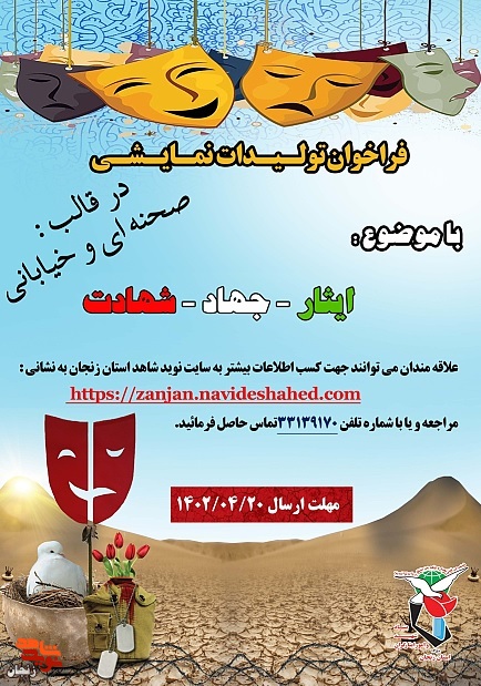 فراخوان تولیدات نمایشی با موضوع ایثار، جهاد و شهادت به همت بنیاد شهید و امور ایثارگران استان زنجان منتشر شد.