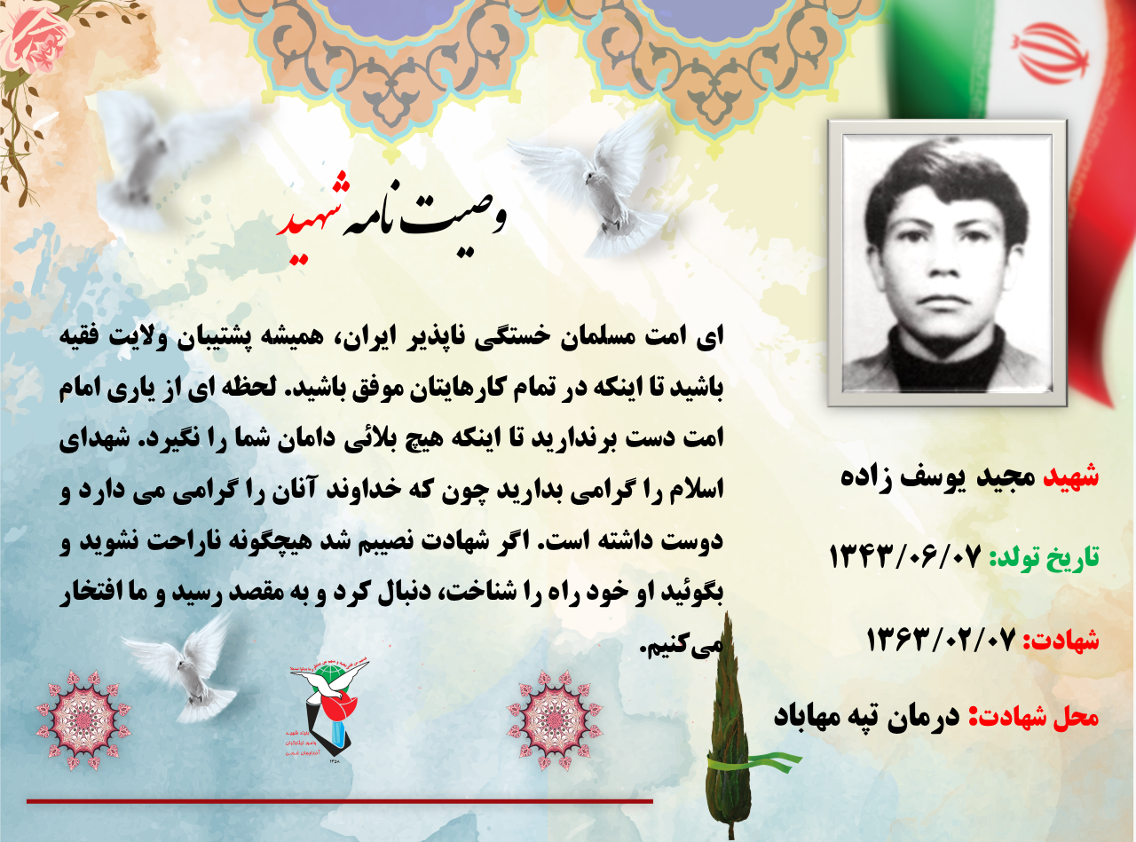 در فرازی از وصیتنامه شهید «مجید یوسف زاده» میخوانیم: «از یاری امام امت دست برندارید.» در راستای ترویج فرهنگ ایثار و شهادت، گزیده موضوعی از وصیتنامه وی در قالب پوستر تهیه و منتشر شد.